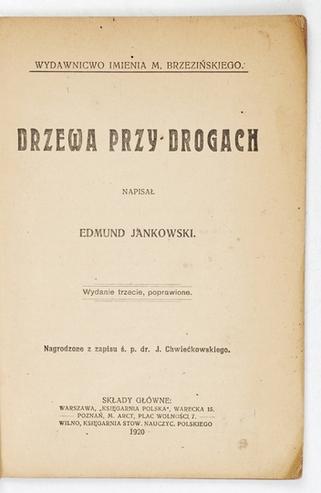 JANKOWSKI Edmund – Drzewa przy drogach. Napisał ... Wyd. III, poprawione. Warszawa 1920. "Księgarnia Polska". 16d, s. 45, [2]. brosz. Wydawnictwo imienia M. Brzezińskiego.
