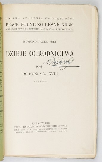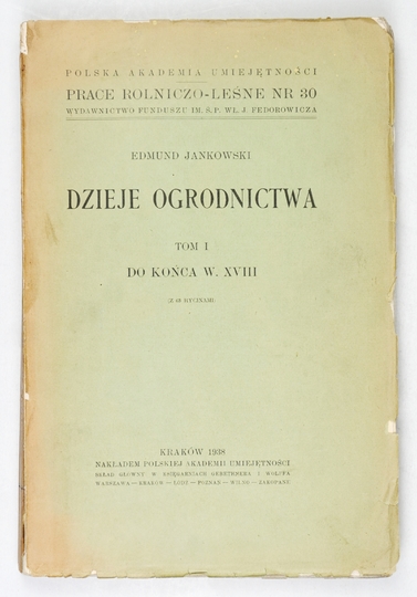 JANKOWSKI Edmund – Dzieje ogrodnictwa. T. 1: do końca w. XVIII. (Z 63 rycinami). Kraków 1938. PAU. 8, s. XI, [1], 279. brosz. Prace Rolniczo-Leśne, nr 30.