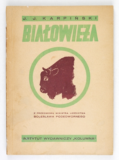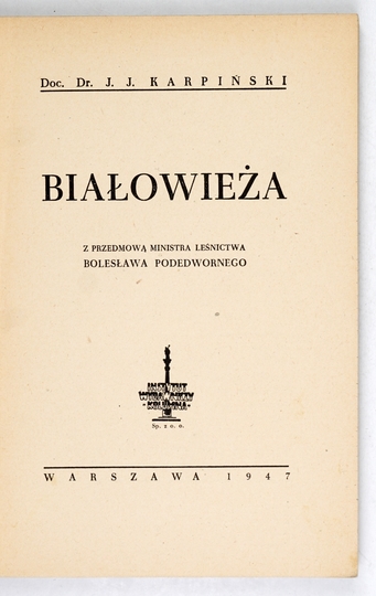 KARPIŃSKI J[an] J[erzy] – Białowieża. Z przedmową ministra leśnictwa Bolesława Podedworskiego. Warszawa 1947. Inst. Wyd. "Kolumna". 8, s. 135, [1], tabl. 32. brosz.