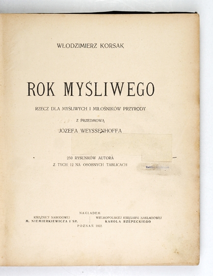 KORSAK Włodzimierz – Rok myśliwego. Rzecz dla myśliwych i miłośników przyrody. Z przedmową Józefa Weyssenhoffa. 250 rysunków autora z tych 12 na osobnych tablicach. Poznań 1922. Nakł. Książnicy Narodowej M. Niemierkiewicza i Sp. [i in.]. 4, s. 340, [2], IV, [1]. opr. oryg. pł. z zach. okł. brosz.