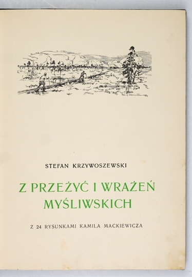 KRZYWOSZEWSKI Stefan – Z przeżyć i wrażeń myśliwskich. Z 24 rysunkami Kamila Mackiewicza. Warszawa 1927. Gebethner i Wolff. 4, s. 124, [3]. opr. ppł. z epoki z zach. okł. brosz.