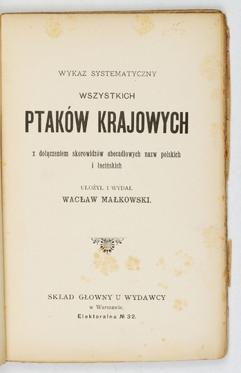MAŁKOWSKI Wacław – Wykaz systematyczny wszystkich ptaków krajowych z dołączeniem skorowidzów abecadłowych nazw polskich i łacińskich. Warszawa [cenz. 1902]. Druk. F. Csernaka. 16d, s. [4], VI, 115. brosz.