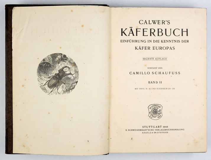 SCHAUDUSS Camillo – Calwer's Käferbuch. Einführung in die Kenntnis der Käfer Europa. Sechste Aufl. Verfasst von ... Bd. 1-2. Stuttgart 1916. E. Schweizerbart'sche Verlagsbuchhandlung. 4, s. [6], 709, tabl. 23; [7], 710-1390, [2], tabl. 28. opr. oryg. psk.