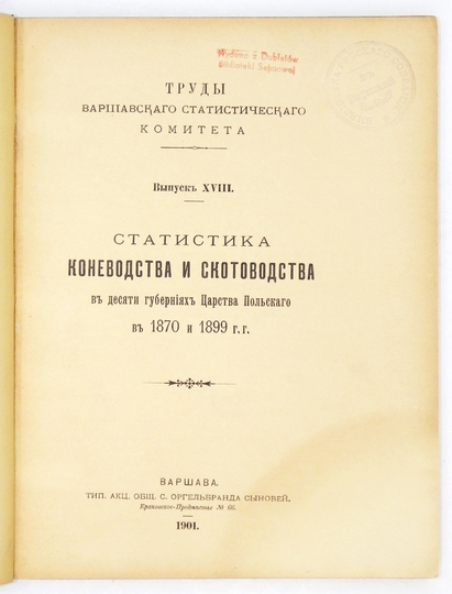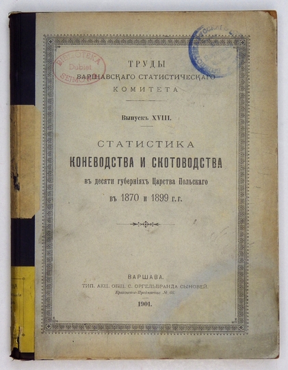 STATISTIKA konevodstva i skotovodstva v desjati gubernijach Carstva Polskago v 1870 i 1899 g.g. Varšava 1901. Varšavskij Statističeskij Komitet. 8, s. [4], 68, 217, [1], 63, [4]. opr. ppł. z epoki, okł. brosz. naklejone na oprawę.