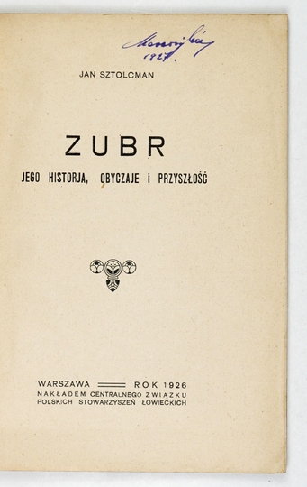 SZTOLCMAN Jan – Żubr, jego historja, obyczaje i przyszłość. Warszawa 1926. Centr. Związek Pol. Stowarzyszeń Łowieckich. 8, s. 104. brosz.