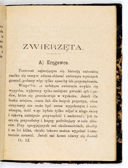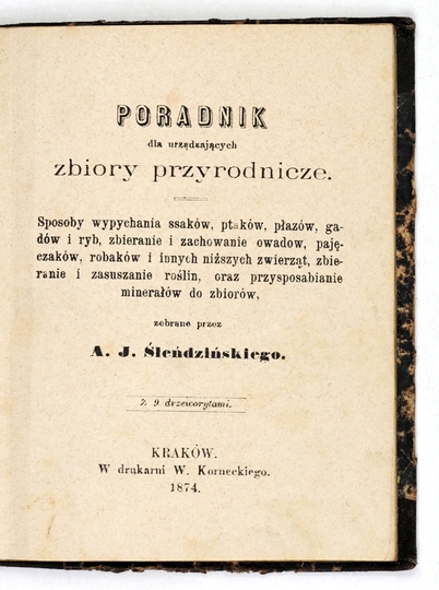 ŚLEŃDZIŃSKI A[leksander] J[an] – Poradnik dla urządzających zbiory przyrodnicze. Sposoby wypychania ssaków, ptaków, płazów, gadów i ryb, zbieranie i zachowanie owadów, pajęczaków, robaków i innych niższych zwierząt, zbieranie i zasuszanie roślin, oraz przysposabianie minerałów do zbiorów. Z 9 drzeworytami. Kraków 1874. Druk. W. Korneckiego. 16, s. [4], 99, [3]. opr. ppł. z epoki z zach. okł. brosz. Bibljot. dla Młodzieży, zesz. 11-12.