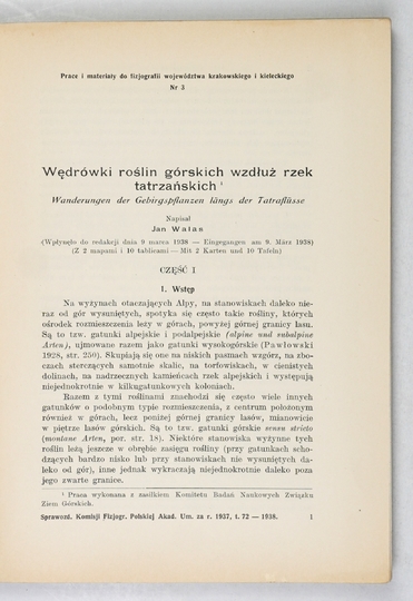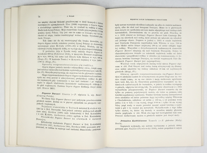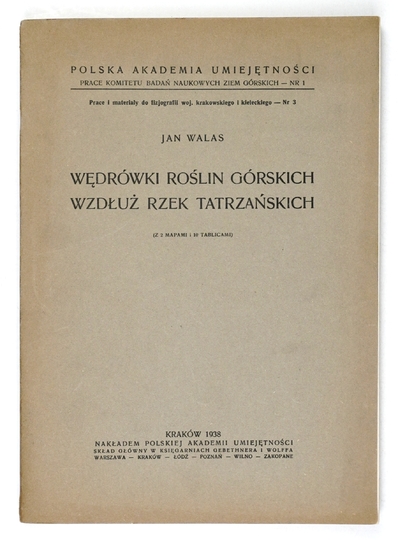 WALAS Jan – Wędrówki roślin górskich wzdłuż rzek tatrzańskich. (Z 2 mapami i 10 tabl.). Kraków 1938. PAU. 8, s. 131, tabl. 10, mapy 2. brosz. Prace Kom. Badań Nauk. Ziem Górskich, nr 1.