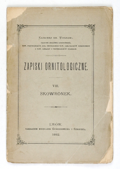 WODZICKI Kazimierz – Zapiski ornitologiczne. T. 8: Skowronek. Lwów 1882. Księg. Gubrynowicza i Schmidta. 16d, s. 102, [2]. brosz.