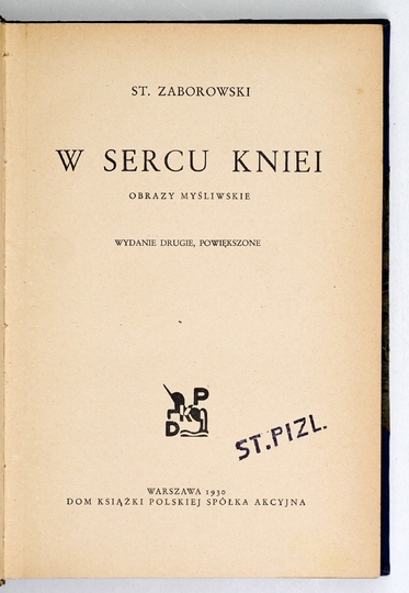 ZABOROWSKI St[anisław] – W sercu kniei. Obrazy myśliwskie. Wyd. II, powiększone. Warszawa 1930. Dom Książki Pol. 8, s. 243, [5]. opr. ppł. z epoki z zach. okł. brosz.