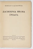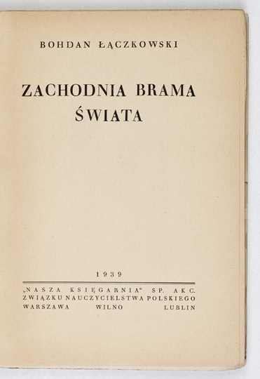 ŁĄCZKOWSKI Bohdan – Zachodnia brama świata. Warszawa 1939. Nasza Księgarnia. 8, s. 144, [1], tabl. 13. brosz.