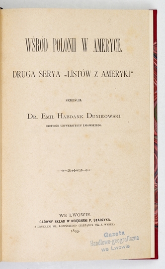 DUNIKOWSKI Emil Habdank – Wśród Polonii w Ameryce. Druga serya "Listów z Ameryki". Lwów 1893. Druk. W. Łozińskiego. 8, s. [6], III, [1], 171. opr. wsp. ppł.