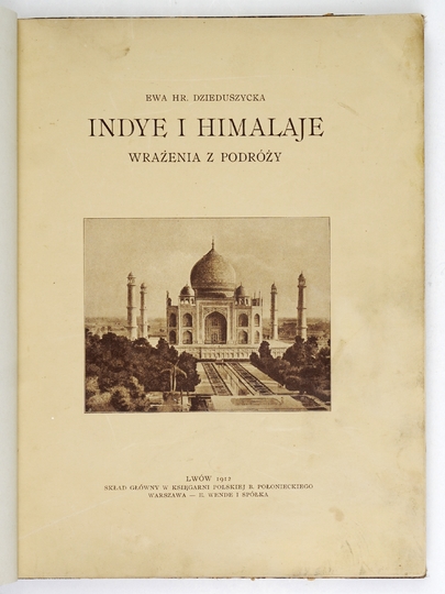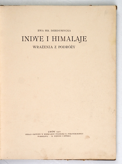 DZIEDUSZYCKA Ewa – Indye i Himalaje. Wrażenia z podróży. Lwów 1912. Druk. W. L. Anczyca i Sp., Kraków. 4, s. [8], 135, [1]. opr. ppł. z epoki z zach. okł. brosz.