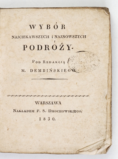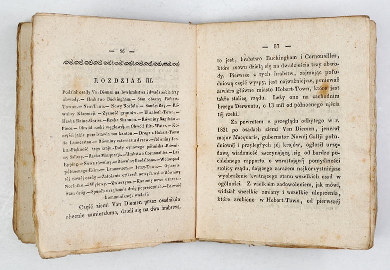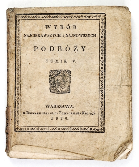 EVANS G[eorge] W[illiam] – Podróż do ziemi Van Diemen, albo Opisanie historyczne, geograficzne i topograficzne tey wyspy przez ..., naczelnego miernika osady. Warszawa 1830. Nakł. F. S. Dmochowskiego. 16, s. [4], 222, [1]. brosz. Wybór Najciekawszych i Najnowszych Podróży, t. 5.