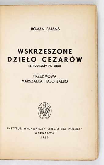 FAJANS Roman – Wskrzeszone dzieło Cezarów. (Z podróży po Libji). Przedmowa marszałka Italo Balbo. Warszawa 1935. Instytut Wyd. "Bibljoteka Polska". 16d, s. 138, [3], tabl. 11. brosz.