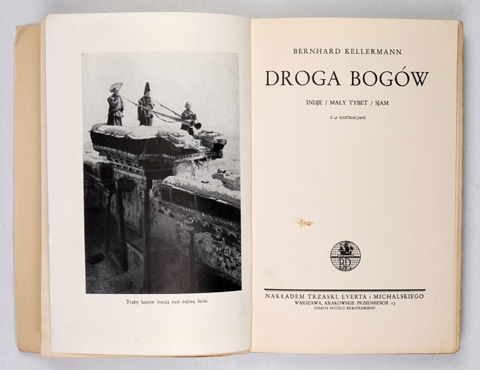 KELLERMANN Bernhard – Droga bogów. Indje, Mały Tybet, Sjam. Z 46 ilustracjami. Warszawa [1935]. Trzaska, Evert i Michalski. 8, s. [4], 205, [2], tabl. 16. brosz., obw. Bibljot. Podróżnicza, t. 2.