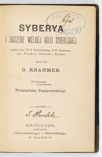 KRAHMER G[ustav] – Syberya i znaczenie wielkiej kolei syberyjskiej podług dzieł W. I. Kowalewskiego, P. P. Semenowa, pułk. Wenjukowa, Habenichta i Domanna oprac. ... W tłómaczeniu i z przedm. Włodzimierza Trąmpczyńskiego. Warszawa 1898. Druk. Granowskiego i Sikorskiego. 16d, s. 150, [1]. opr. bibliot. ppł. z epoki. [Bibliot. Dzieł Wyborowych, nr 51].