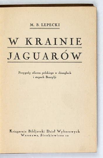 LEPECKI M[ieczysław] B[ohdan] – W krainie jaguarów. Przygody oficera polskiego w dżunglach i stepach Brazylji. Warszawa [1925]. Bibliot. Dzieł Wyborowych. 16d, s. 142, [1]. opr. oryg. ppł. Bibliot. Dzieł Wyborowych, t. 10.