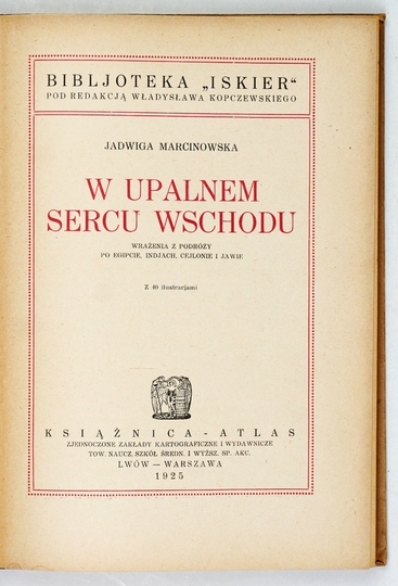 MARCINOWSKA Jadwiga – W upalnem sercu Wschodu. Wrażenia z podróży po Egipcie, Indjach, Cejlonie i Jawie. Z 40 ilustracjami. Lwów-Warszawa 1925. Książnica-Atlas. 8, s. [4], 246, [2]. opr. oryg. ppł. Bibljot. "Iskier", [t.] 2.
