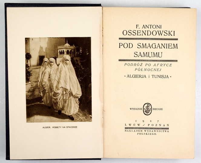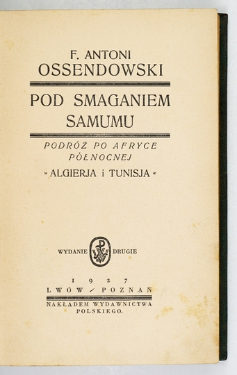 OSSENDOWSKI F[erdynand] Antoni – Pod smaganiem samumu. Podróż po Afryce Północnej. Algierja i Tunisja. Wyd. II. Lwów-Poznań 1927. Wydawnictwo Polskie. 8, s. 334, [15]. opr. luksusowa skóra zdob.