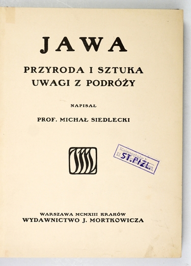 SIEDLECKI Michał – Jawa. Przyroda i sztuka. Uwagi z podróży. Warszawa-Kraków 1913. Wyd. J. Mortkowicza. 4, s. XIV, 294, [1], mapy rozkł. 2, tabl. 30. opr. pł. z epoki z zach. okł. brosz.