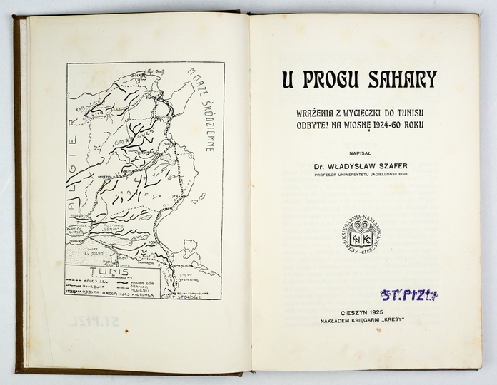 SZAFER Władysław – U progu Sahary. Wrażenia z wycieczki do Tunisu odbytej na wiosnę 1924-go roku. Cieszyn 1925. Księg. "Kresy". 8, s. 181, [2], tabl. 30. opr. oryg. pł.