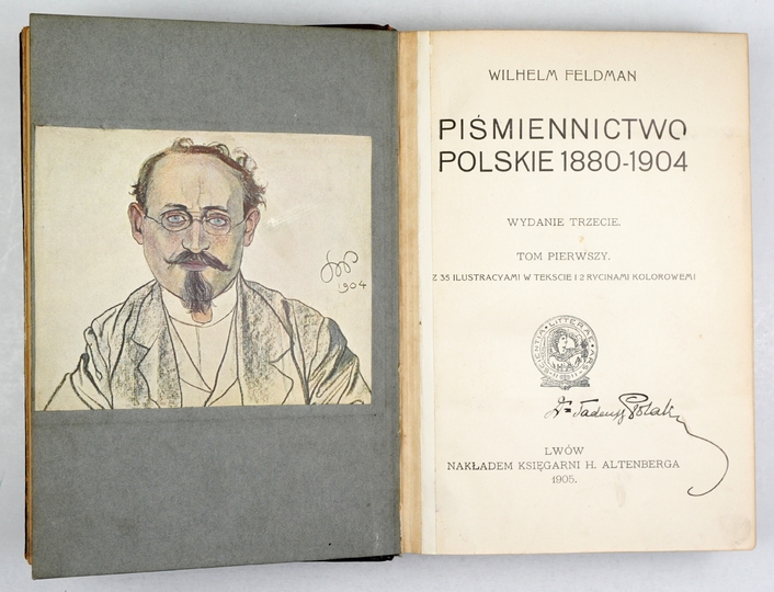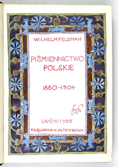FELDMAN Wilhelm – Piśmiennictwo polskie 1880-1904. T. 1-4. Wyd. III. Lwów 1905. Księg. H. Altenberga. 8, s. [12], 292, tabl. 2; [4], 251, tabl. 2; [4], 243, tabl. 4; [4], 454. opr. w 2 wol. psk. z epoki, obcięcie marmoryzowane.