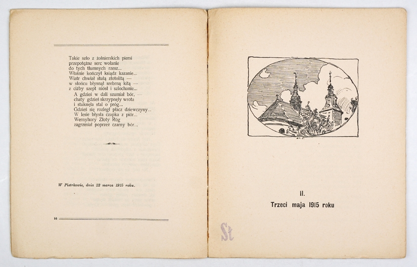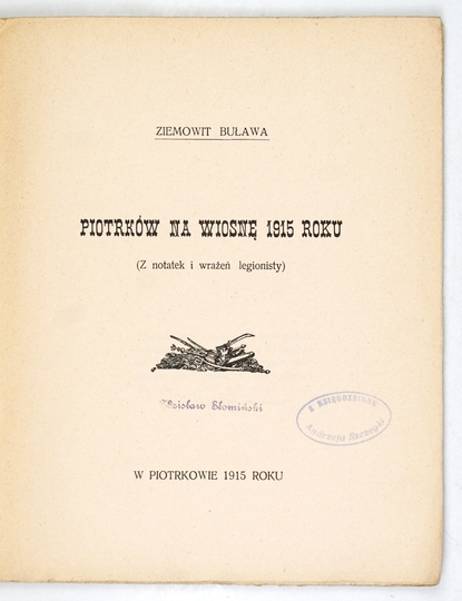 [GRABOWSKI Tadeusz Stanisław]. Ziemowit Buława [pseud.] – Piotrków na wiosnę 1915 roku. (Z notatek i wrażeń legionisty). Piotrków 1915. Druk. Państw. pod zarz. NKN. 8, s. 68. brosz.