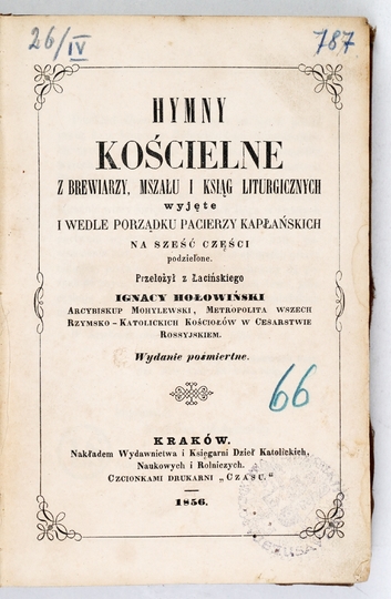 HOŁOWIŃSKI Ignacy – Hymny kościelne z brewiarzy, mszału i ksiąg liturgicznych wyjęte i wedle porządku pacierzy kapłańskich na sześć części oddzielone. Przełożył z łacińskiego ... Wyd. pośmiertne. Kraków 1856. Wyd. i Księgarnia Dzieł Katolickich, Naukowych i Rolniczych. 16d, s. 432. opr. pł. z epoki.