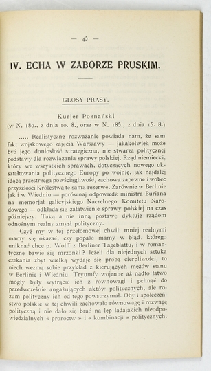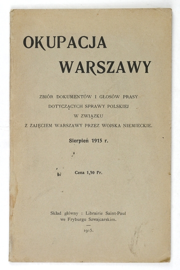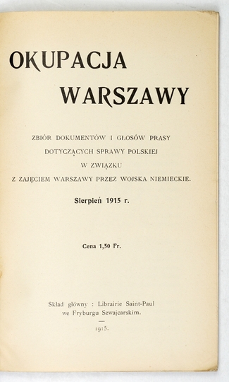 OKUPACJA Warszawy. Zbiór dokumentów i głosów prasy dotyczących sprawy polskiej w związku z zajęciem Warszawy przez wojska niemieckie. Fryburg, VIII 1915. Skład gł. Librairie Saint-Paul. 8, s. 106. brosz.