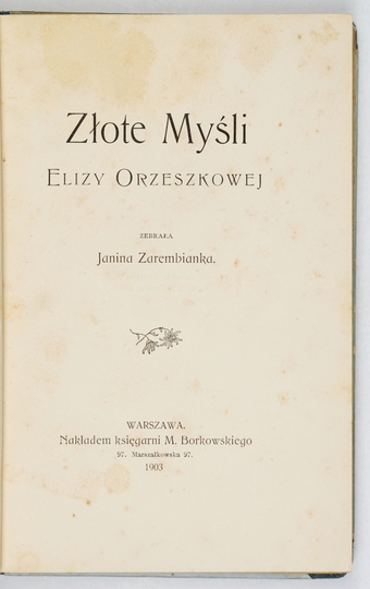 ORZESZKOWA Eliza – Złote myśli ... Zebrała Janina Zarembianka. Warszawa 1903. Księg. M. Borkowskiego. 16d, s. 183, [1]. opr. oryg. ppł.