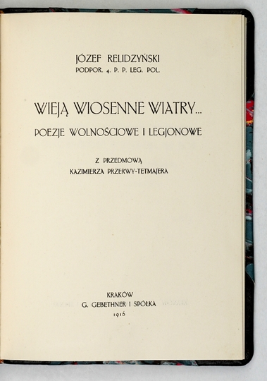 RELIDZYŃSKI Józef – Wieją wiosenne wiatry... Poezje wolnościowe i legjonowe. Z przedmową Kazimierza Przerwy-Tetmajera. Kraków 1916. G. Gebethner i Sp. 16d, s. 99, [2], tabl. 1. opr. wsp. psk.