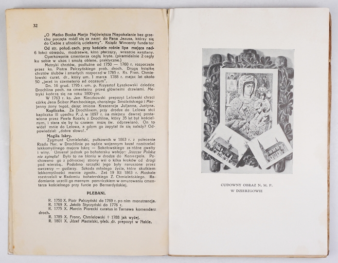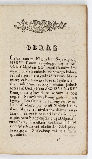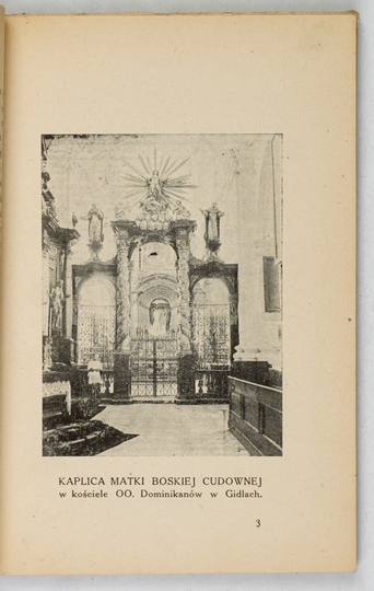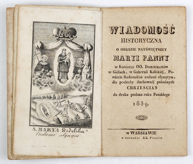 WIADOMOŚĆ historyczna o obrazie nayświętszey Maryi Panny w Kościele OO. Dominikanów w Gidlach, w Guberni Kaliskiej, Powiecie Radomskim cudami słynącym, dla pociechy duchownej pobożnych chrześcian do druku podana. Warszawa 1839. Druk. XX. Piiarów. 16d, s. 80, tabl. 1. opr. miękka kart. z epoki.