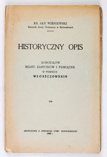 WIŚNIEWSKI Jan – Historyczny opis kościołów, miast, zabytków i pamiątek w powiecie włoszczowskim. Marjówka Opocz. 1932. Druk. Szkoły Rzemiosł. 8, s. [4], 317, [1], tabl. 4. brosz.