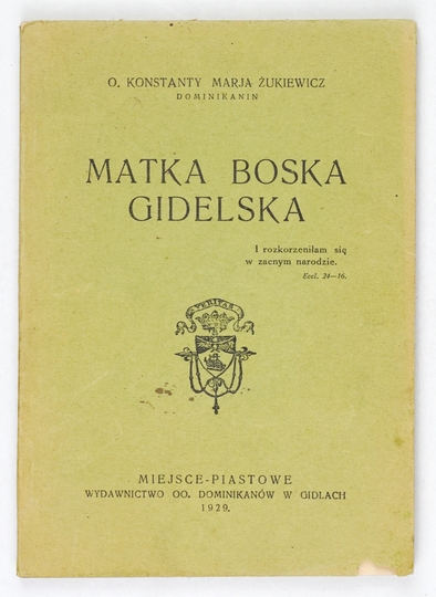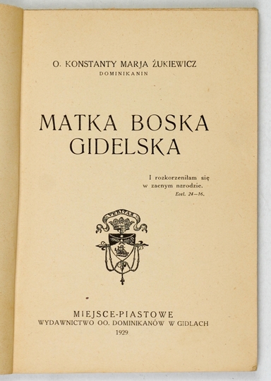 ŻUKIEWICZ Konstanty Marja – Matka Boska Gidelska. Miejsce-Piastowe 1929. Wyd. OO. Dominikanów w Gidlach. 16d, s. 161, [3]. brosz.