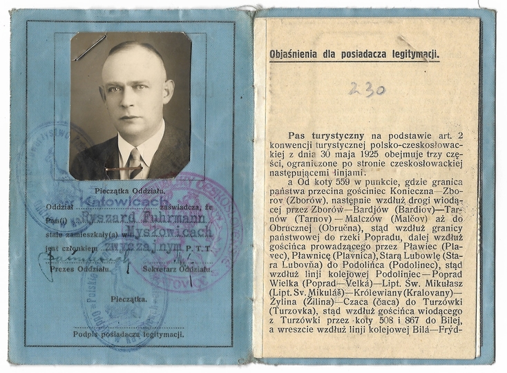 LEGITYMACJA członkowska Polskiego Towarzystwa Tatrzańskiego na nazwisko Ryszarda Fuhrmanna z Mysłowic wystawiona przez katowicki oddział PTT w 1936.