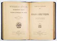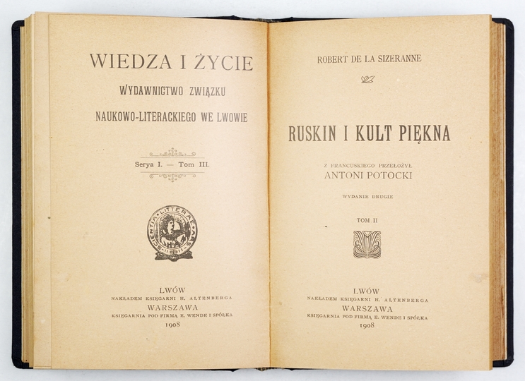 SIZERANNE Robert de la – Ruskin i kult piękna. Z francuskiego przeł. Antoni Potocki. Wyd. II. T. 1-2. Lwów-Warszawa 1908. Księg. H. Altenberga, Księg. p. f. E. Wende i Sp. 16d, s. [4], 162; [4], 171, [2]. razem opr. nieco późn. pł. Wiedza i Życie, seria 1, t. 1, 3.