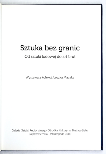 [KATALOG]. Galeria Sztuki Regionalnego Ośrodka Kultury w Bielsku-Białej. Sztuka bez granic. Od sztuki ludowej do art brut. Wystawa z kolekcji Leszka Macaka. Bielsko-Biała 24 X-19 XI 2008. 4, s. 85, [3]. opr. oryg. kart.