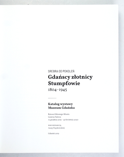 [KATALOG]. Muzeum Gdańska. Srebra od pokoleń. Gdańscy złotnicy Stumpfowie 1804-1945. Katalog wystawy...pod red. Anny Frąckowskiej. Gdańsk 2019. 4, s. 406. opr. oryg. kart.