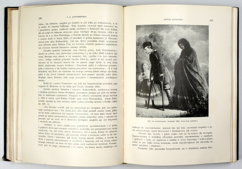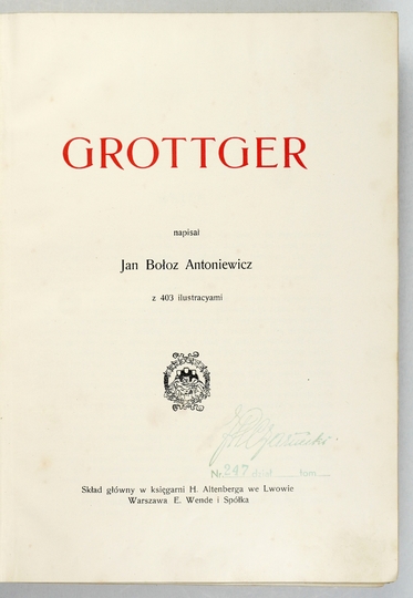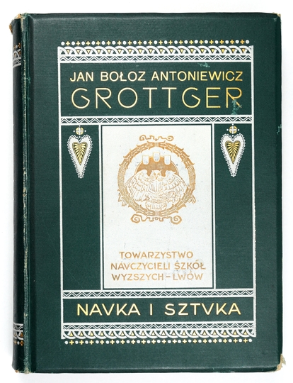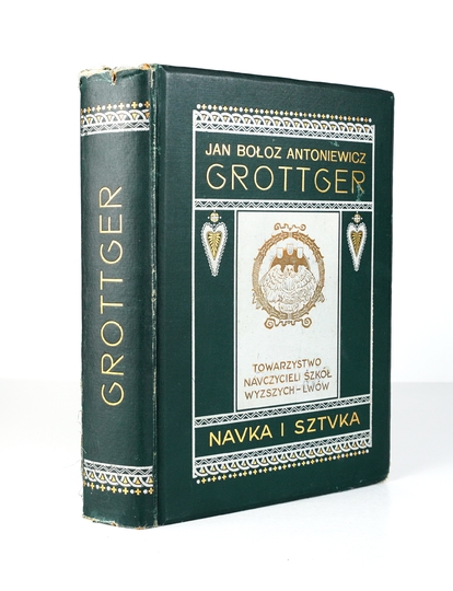 ANTONIEWICZ Jan Bołoz – Grottger. Z 403 ilustracyami. Lwów 1910. Wyd. Tow. Nauczycieli Szkół Wyższych we Lwowie. 8, s. [4], 592, tabl. 32 [w tym 8 barwnych ]. opr. oryg. pł. zdob., górne obcięcie złoc. Nauka i Sztuka, t. 11.