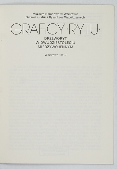[KATALOG]. Muzeum Narodowe w Warszawie, Gabinet Grafiki i Rysunków Współczesnych. Graficy "Rytu". Drzeworyt w dwudziestoleciu międzywojennym. Warszawa 1989. 8, s. [24]. brosz.