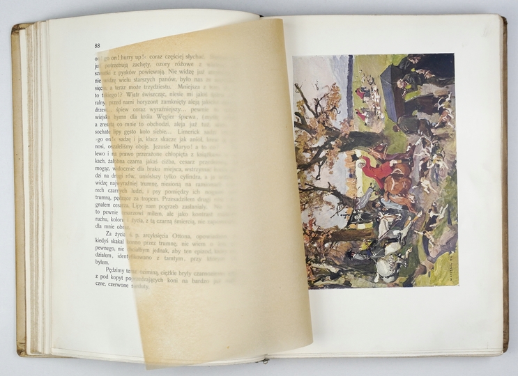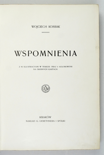 KOSSAK Wojciech – Wspomnienia. Z 92 illustracyami w tekście oraz 8 kolorowemi na osobnych kartach. Kraków 1913. Nakł. G. Gebethnera i Spółki. 4, s. [14], 348, tabl. 12 (w tym 8 barwnych). opr. pł. z epoki, górne obcięcie złoc.