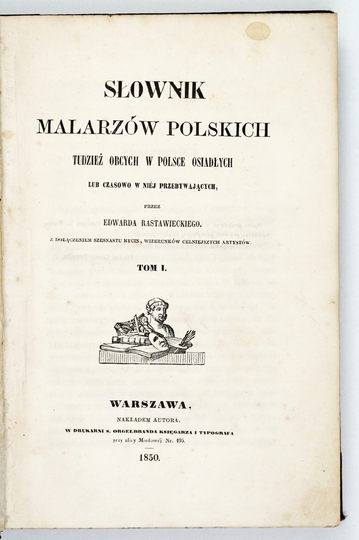 RASTAWIECKI Edward – Słownik malarzów polskich, tudzież obcych w Polsce osiadłych lub czasowo w niej przebywających. T. 1. Warszawa 1850. Nakł. autora. 8, s. [4], VIII, 334, tabl. 6. opr. ppł. z epoki.