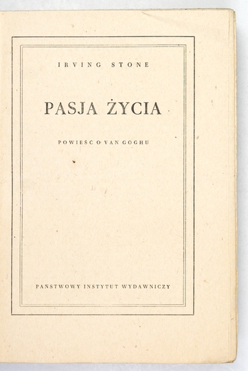 STONE Irving – Pasja życia. Powieść o van Goghu. Warszawa 1954. PIW. 8, s. 430, [2]. tabl. 16. brosz.
