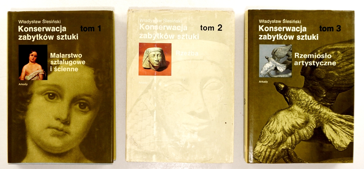 ŚLESIŃSKI Władysław – Konserwacja zabytków sztuki. T. 1-3. Warszawa 1995. Arkady. 8, s. 178, tablice (100 ilustracji na tabl.); 173, [3], tablice (100 ilustracji na tabl.); 230, tablice (93 ilustracje na tabl.). opr. oryg. pł., obw.