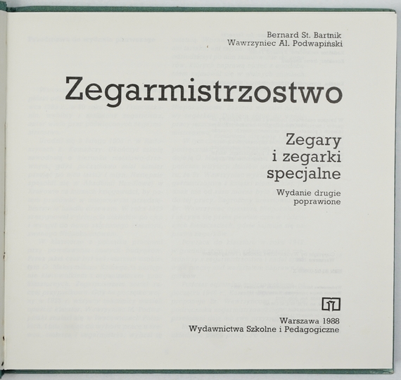 BARTNIK Bernard St., PODWAPIŃSKI Wawrzyniec Al. – Zegarmistrzostwo. T. 11: Zegarki i zegary specjalne. Wyd. II poprawione. Warszawa 1988. WSiP. 8 podł., s. 203, [1]. opr. oryg. kart.