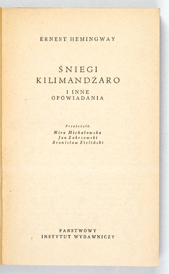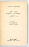 HEMINGWAY Ernest – Śniegi Kilimandżaro i inne opowiadania. Przeł. Mira Michałowska, Jan Zakrzewski, Bronisław Zieliński. Warszawa 1956. PIW. 16d, s. 334, [2]. brosz.