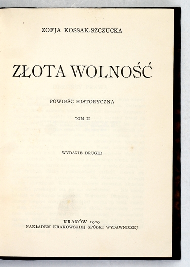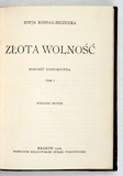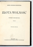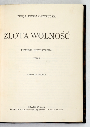 KOSSAK Zofia – Złota wolność. Powieść historyczna. T. 1-2. Wyd. II. Kraków 1929. Krakowska Spółka Wydawnicza. 8, s. [4], 282, [1]; [4], 285, [2]. opr. późn. ppł.