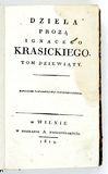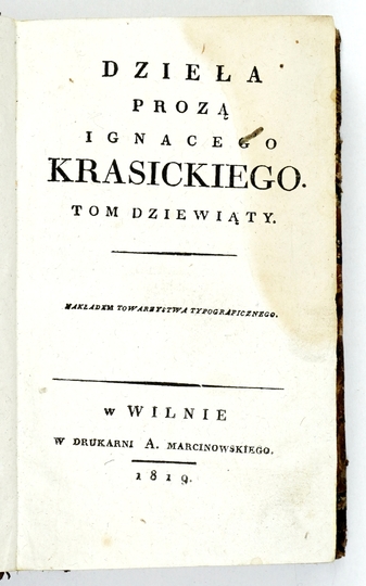 KRASICKI Ignacy – Dzieła ... Edycya nowa i zupełna podług wydania Franciszka Dmochowskiego. T. 9. Wilno 1819. Nakładem Towarzystwa Typograficznego. W Drukarni A. Marcinowskiego. 16d, s. [4], 616. opr. psk. z epoki.