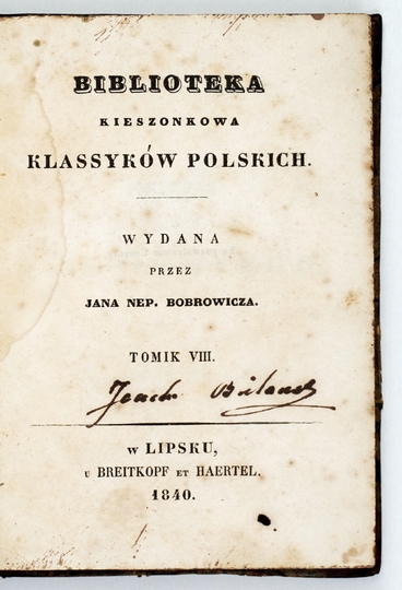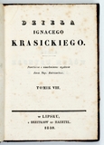 KRASICKI Ignacy – Dzieła ... Tomik 8. Lipsk 1840. J. N. Bobrowicz. U Breitkopf et Haertel. 16, s. 296. opr. psk. z epoki. Bibliot. Kieszonkowa Klassyków Polskich, t. 8.