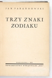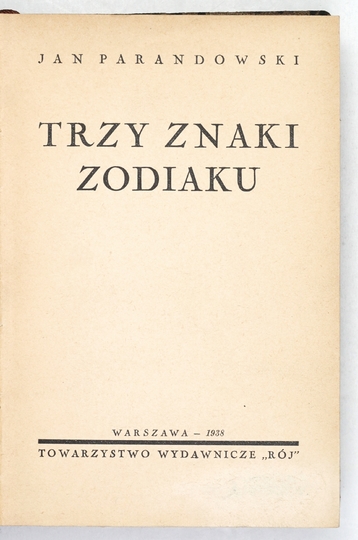 PARANDOWSKI Jan – Trzy znaki zodiaku. Warszawa 1938. Rój. 16d, s. 244, [3]. opr. pł. zdobione z epoki.
